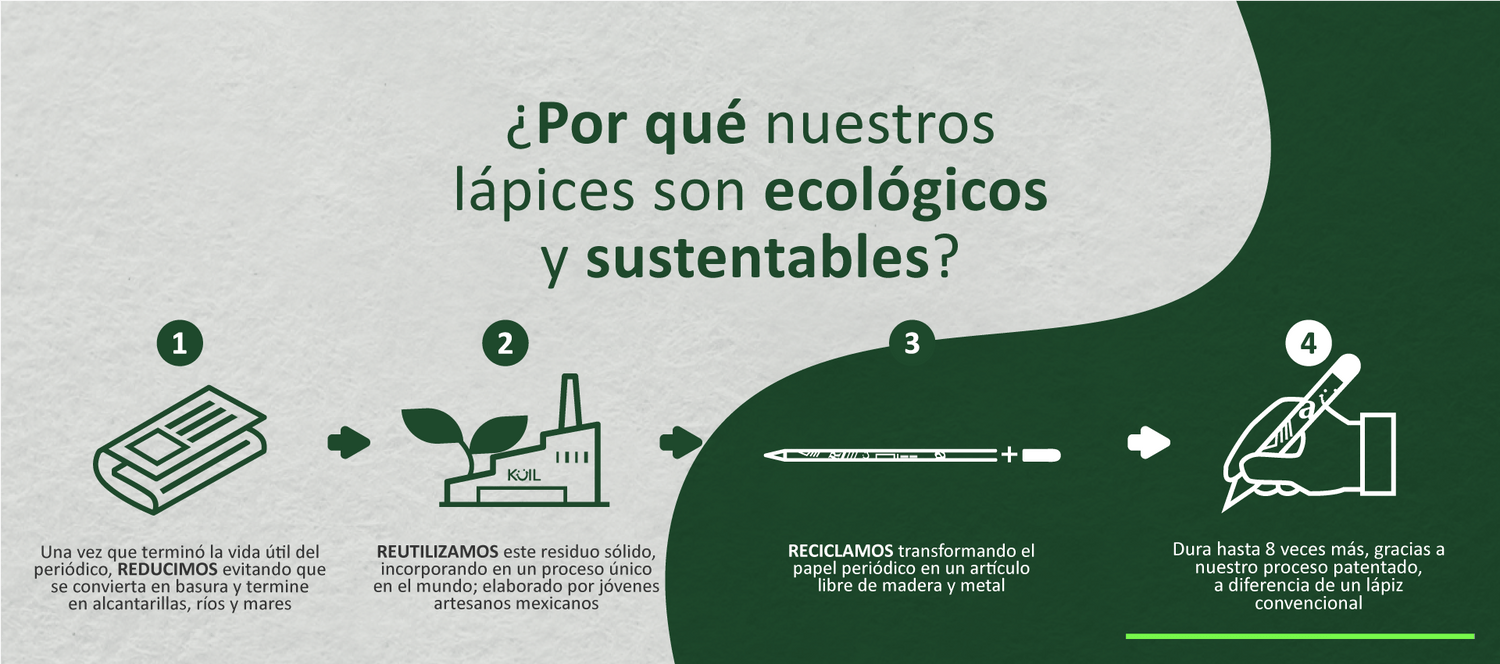 Nuestros productos son amigables con el medio ambiente, ya que están hechos con las 3R's y dentro de una economía circular, pero lo mejor es que genera un impacto positivo a la huella de carbono, pues los residuos sólidos como lo es el papel periódico lo REDUCIMOS, evitando que se conviertan en basura que puede terminar en alcantarillas, ríos o mares; REUTILIZAMOS, es decir, damos otro nuevo uso, que en el caso de los lápices normalmente son de madera, evitando talar árboles, pues al día de hoy, cada árbol que perdemos hace falta; RECICLAMOS transformando el periódico en una pieza única que expresa nuestra gratitud a nuestra madre tierra.